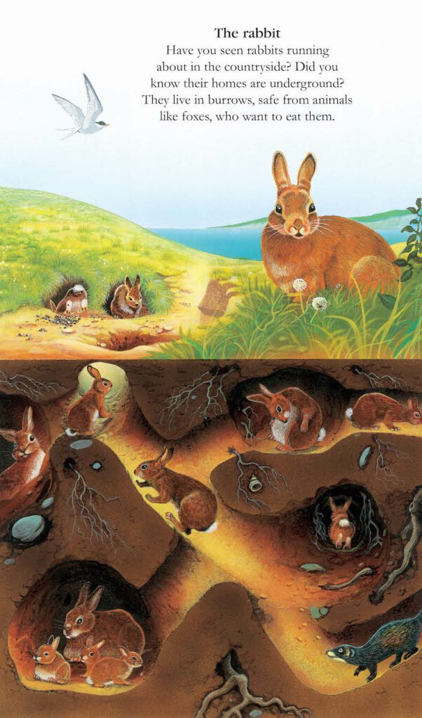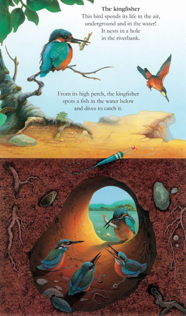 It’s so dark underground, you can’t see the animals who live down there – but with the help of your ‘magic’ torch, you’ll get to explore their hidden homes. Run with the rabbit into its burrow. Follow the mole through its tunnels. Swim with the beaver to its lodge. Swoop with the kingfisher into its riverbank nest. You’ll even discover how the extraordinary cockchafer is born and grows up entirely underground.