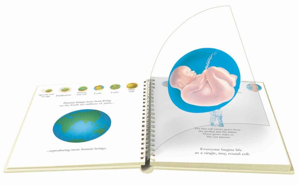Peel back the transparent pages to uncover the body's organs, bones, and blood vessels.