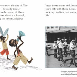 Born in New Orleans in 1901, Louis Armstrong loved the gospel singing he heard every week as a boy in his neighbourhood church. He was also inspired by the marching bands and the musicians and singers who celebrated mardi gras in the streets, and performed at funerals and in the many cabarets. The trumpet was his favorite instrument, and he taught himself to play it. From his teenage years on, music was his life. He started as a professional musician playing on the Mississippi river boats before joining various bands. He soon established himself as the best musician of his generation, and at the age of 25 created his own jazz group—the Hot Five. Soon all of America would discover his other extraordinary talent—his unique deep singing voice.
