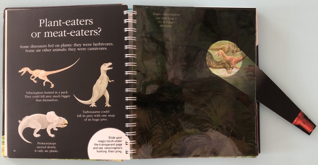 - lights up one small part of the illustration at a time, revealing hidden details on the darkened transparent pages.