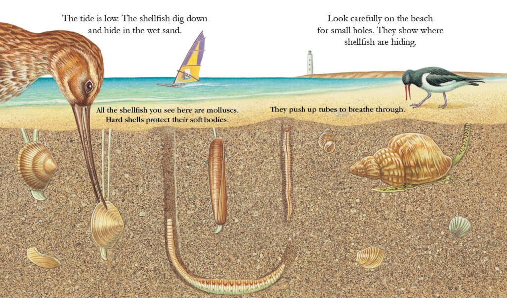 The tide is out, let’s explore! Look for colourful shells, dig in the sand, and peek under stones. See where crabs and shrimps hide, and find starfish, oysters, and mussels. Discover all the fish that live on the sea bed; why they are flat and how they hide from predators. There’s lots to learn in a day out at the seashore!