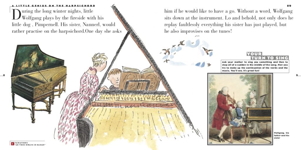 Mozart was already writing music by the age of five, and when he was still very young, he traveled all over Europe and played for the Emperor of Austria, the King of France, and the Queen of England. Children who know songs from different countries, or who have tried writing songs of their own, they'll find that they have much in common with Mozart.